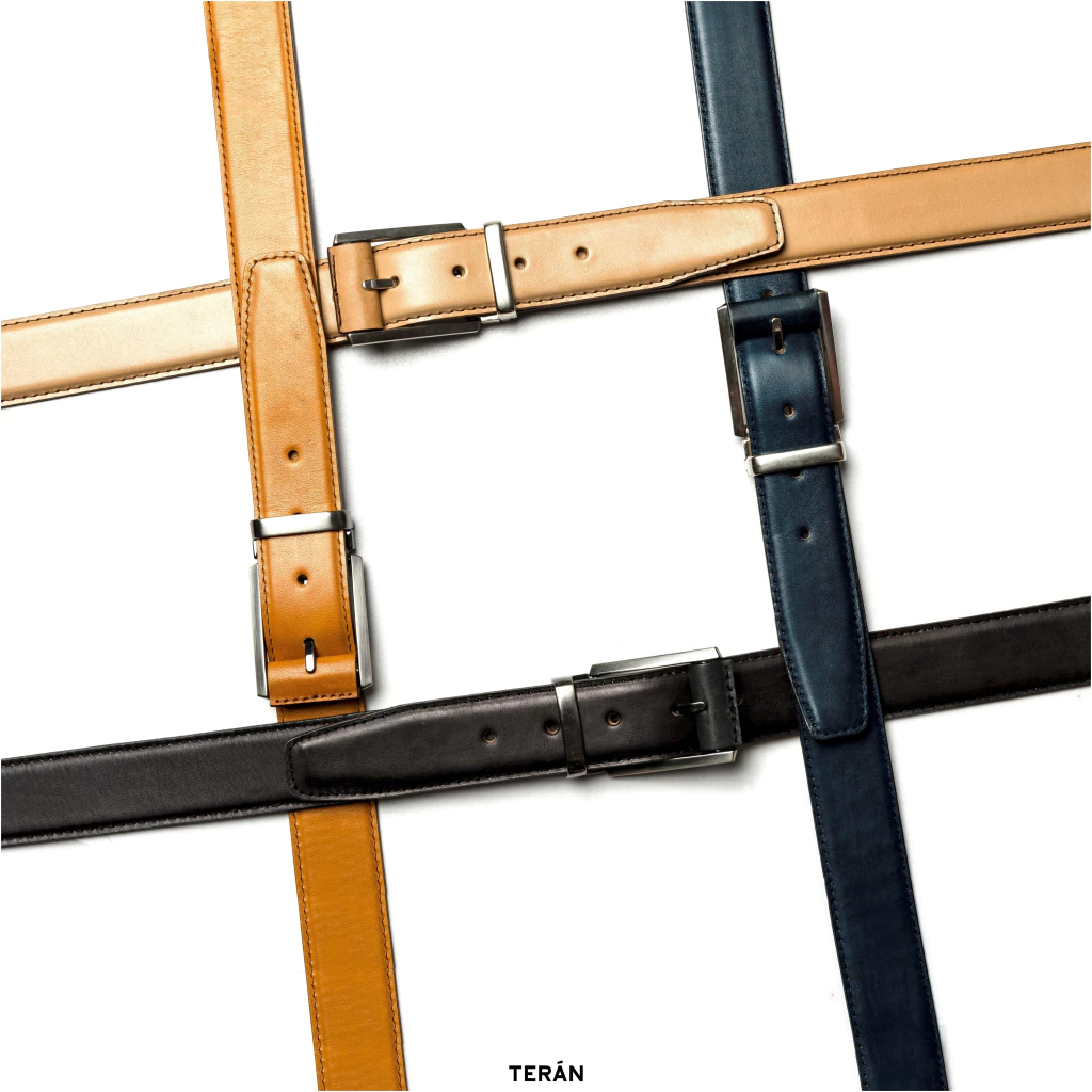 Cinturón de cuero vacuno de curtido natural patinado color ámbar. Forro de nobuk vacuno. Hebilla desmontable. Largo adaptable. Ancho de 3,5 cm.