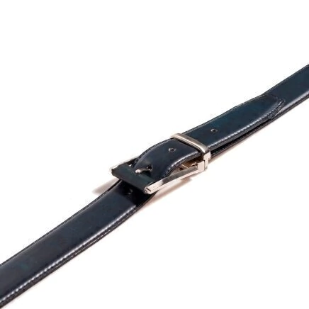 Cinturón de cuero vacuno de curtido natural patinado color azul. Forro de nobuk vacuno. Hebilla desmontable. Largo adaptable. Ancho de 3,5 cm.