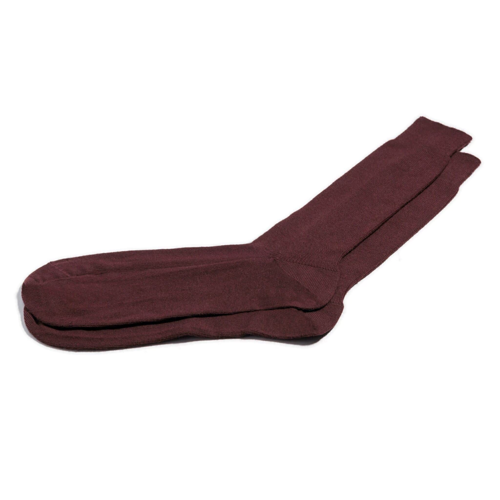 Media gruesa lisa de vestir, media caña, 75% algodón, 25% poliamida con puños con elastano. Puntera y talón demarcados. Color bordó.