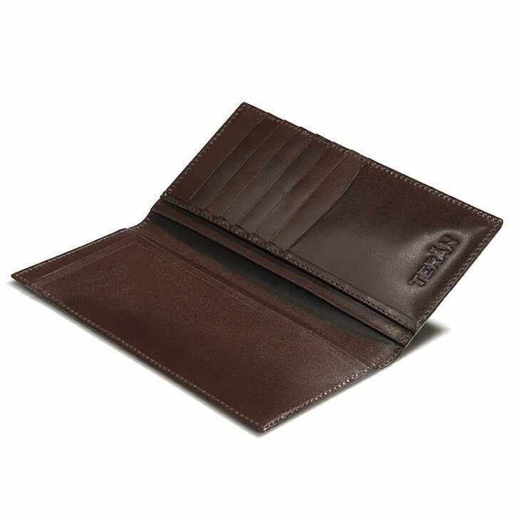 Billetera tipo plegable americana en cuero vacuno anilina color marrón. Siete bolsillos para tarjetas. Un compartimiento para billetes o chequera y dos para billetes de varios tamaños. Forro en acetato marrón.