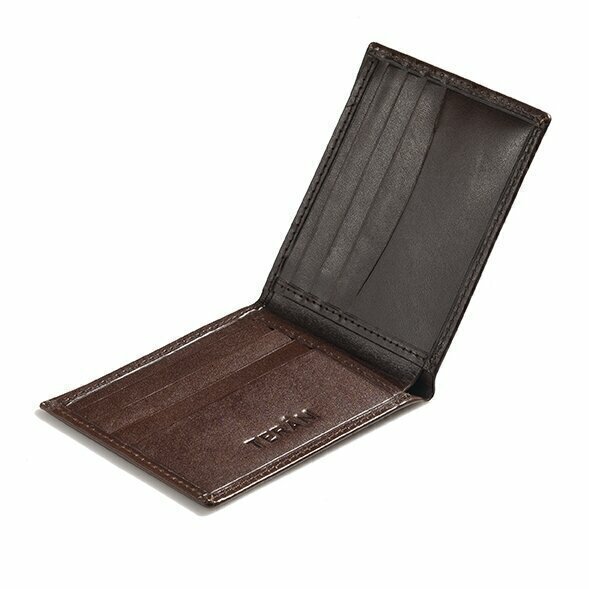 Billetera tipo plegable en cuero vacuno anilina color marrón. Diez bolsillos para tarjetas, 5 a cada lado. Compartimento para billetes de varios tamaños. Forro en acetato marrón